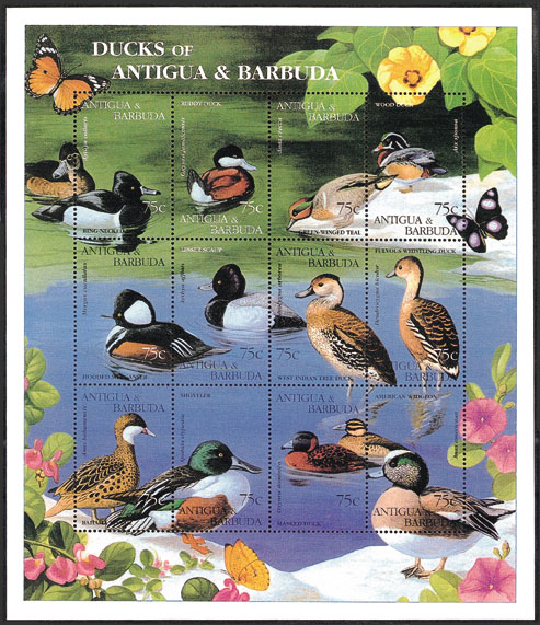 上段;黒輪金黒、アカオタチガモ、小鴨、アメリカオミ 中段;アイサ(秋沙)、小鈴鴨、嘴黒琉球鴨、アメリカリュウキュウカモ 下段;リュウキュウカモと小鴨の仲間 シート地には水辺の花とこれらの花に寄ってくる蝶も描かれています アンチグア・バーブーダ発行の小型シート
