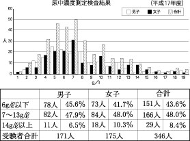 平成17年度は、尿中食塩濃度検査は一学年305名、2年生3年生の希望者41名、血圧測定、貧血検査、血中脂質検査は309名(一年生全員)、2年生3年生の希望者138名。