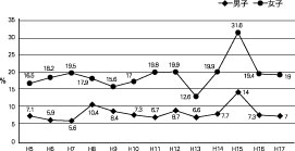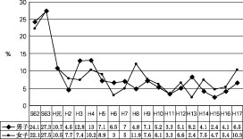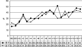 高コレステロール者の年度別推移は、平成5年度からを見ると、男子7.1%、女子16.5%であったが、平成17年度では、男子7%、女子19%で、男子の平成7年度から見ると漸増傾向にある。