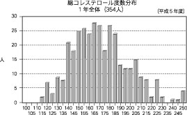 総コレステロールの度数分布を示す。160−170mg/dlを中心とする。