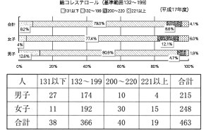 コレステロール高値者については、平成5年度より7年度まで、男子19名、女子38名で観察すると、男子の9名が高値から高値へ、4名が高値から正常値へ、女子では、21名が高値から高値へ、13名が高値から正常値への変化であった。