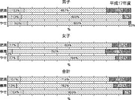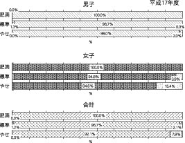 肥満度をBMIで示すと、女子5.3%、男子7.0%が肥満。