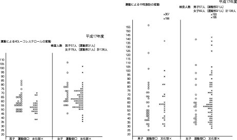 運動により、善玉コレステロールは増加するといわれているので、2年生3年生の57名(運動部員31名)、女子79名(運動部員21名)で比較検討した。中性脂肪については減少するといわれているので、同じ男子57名と女子82名(運動部員21名)で比較検討した。善玉コレステロールはわずかではあるが、増加しているように思える。中性脂肪については、男子はわずかながら減少しているように見える。女子は判断しにくい。