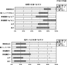 味噌汁は家族に高血圧の人がいる家と食塩濃度高値者に毎日摂る人は多い。当然ながら塩辛いのもよく食べている。インスタント食品も食塩濃度高値者は良く食べる。スナック菓子は食塩濃度高値者には少ない。加工食品は全体がよく食べており、毎日、週に2−3回を合わせると75%になる。冷凍食品は6g/1以下の者が多い。獣鳥肉類は全体によく摂っている。90%になる。その中では、総コレステロール高値者は毎日摂る者が少ない。魚介類は食塩濃度高値者に毎日食べる人が多い。卵を毎日食べるのは家族に高血圧症のいる人が多い。豆腐、納豆、大豆類は食塩濃度高値者はよく食べている。昆布類も食塩濃度高値者がよく食べている。野菜類については、皆良く食べているが、食塩濃度高値者は低い。果物も低い。レバーは殆ど食べていない。牛乳、乳製品は83%ぐらいが摂っている。その中では食塩濃度高値者はやや少ない。