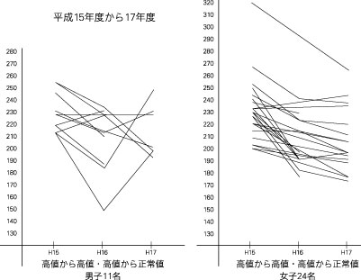 同じく、平成15年度から17年度で、コレステロール高値者、男子28名、女子47名で観察すると、男子15名は正常から正常の変化、6名は高値から高値へ、5名は高値から正常値へ、女子では、22名が正常から正常へ、12名が高値から高値へ、同じく12名が高値から正常値への変化であった。これを、折れ線グラフで示す。