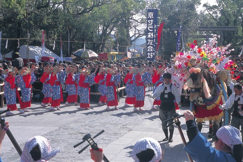 鈴懸け馬が踊る、人が踊る。人が踊れば馬は静かに待つ。 踊りを楽しむのは人か馬か。 ポンパチの乾いた音とともに春の訪れである。 (鹿児島神宮、霧島市隼人町)