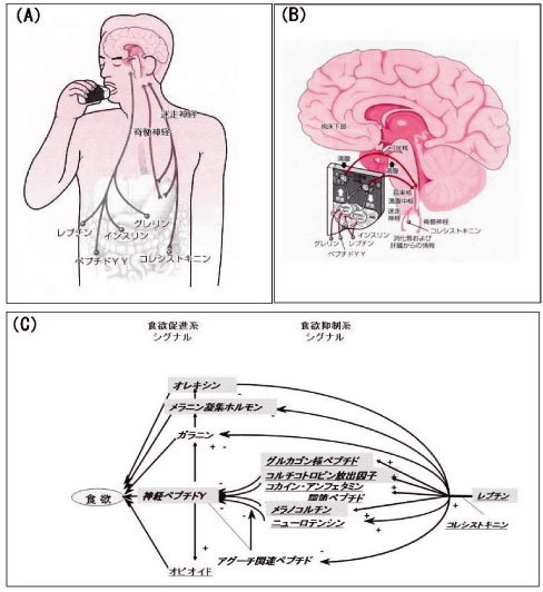(A)胃が空虚になるとグレリン分泌は促進し、食欲が生じ、摂食行動が開始される。摂食後にはコレシストキニン(CCK)やペプチドYY(PYY)などの満腹ホルモンが増加し、食欲は抑制され、摂食行動は停止する。1回1回の食事量の総和は体脂肪量の増減となり、体脂肪量に応じて血中に放出されるレプチンが、長期にわたる体脂肪量の調節を行う。(B)レプチンやグレリンは、液性及び神経性にその情報を中枢神経系に伝え、視床下部の強力な食欲促進系−神経ペプチドY(NPY)/ アグーチ関連ペプチド(AgRP)、および食欲抑制系−メラノコルチン(POMC)/ コカイン・アンフェタミン調節ペプチド(CART)に相反する作用を営む。すなわち、レプチン低下 / グレリンの増加(体脂肪量の低下)は食欲促進系(NPY / AgRP)を活性化させ、レプチンの増加 / グレリンの低下(体脂肪量の増加)は食欲抑制系(POMC / CART)を活性化させる。レプチンは視床下部弓状核(ARC)にある受容体に結合後、JAK-STAT系及び一部IRS−PI(3)kinase系を活性化させ、そのシグナルは室傍核(PVN)などに伝えられ、食欲抑制、エネルギー消費促進作用が発現される。しかし、進化の長い歴史にあっては、この調節系は主としてエネルギーの備蓄に関わったという。(C)図中斜体下線は食欲・体脂肪量抑制シグナルを、斜体は食欲・体脂肪量促進シグナルを示す。網目部分は、薬理学的検討や遺伝子組み換えマウスを用いた成績から、体重調節への作用が明確に示されたものを示す。カスケードの流れは一方向ではなく、例えば神経ペプチドYからメラノコルチン系への抑制が、その食欲促進作用に重要である。