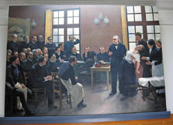 初めて2階へ上ってみると、廊下の壁面には、シャルコ(Jean Martin Charcot)が臨床講義をしている大きな絵画が展示され、そこには、女性を支えているバビンスキー反射の発見者バビンスキーなども描かれていた(写真)。