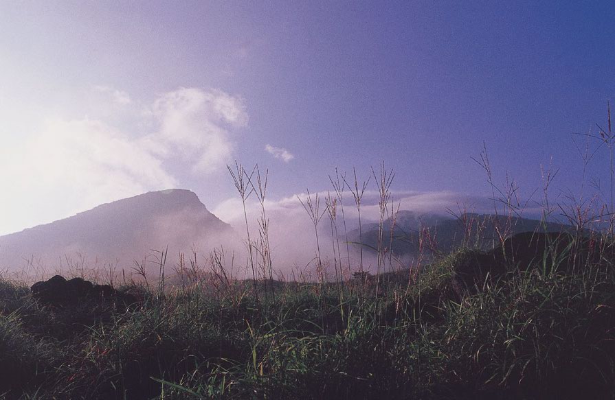 「えびの」は、「えび色のススキがある野」が由来、「えびの高原」は、1960年頃えびのを観光地として開発した、宮崎交通の岩切章太郎さんが名付けた、という。葡萄葛(えびかずら、やまぶどう)の実の赤紫色がえび色で、これに茶を加えたものが、葡萄茶色(えびちゃいろ)とされている。えびの高原では、初秋に美しいえび茶色のススキの花穂が見られる。この写真は韓国岳頂上を目指して暗い内から登ったが5合目で日の出撮影を断念、下山して撮った1枚。