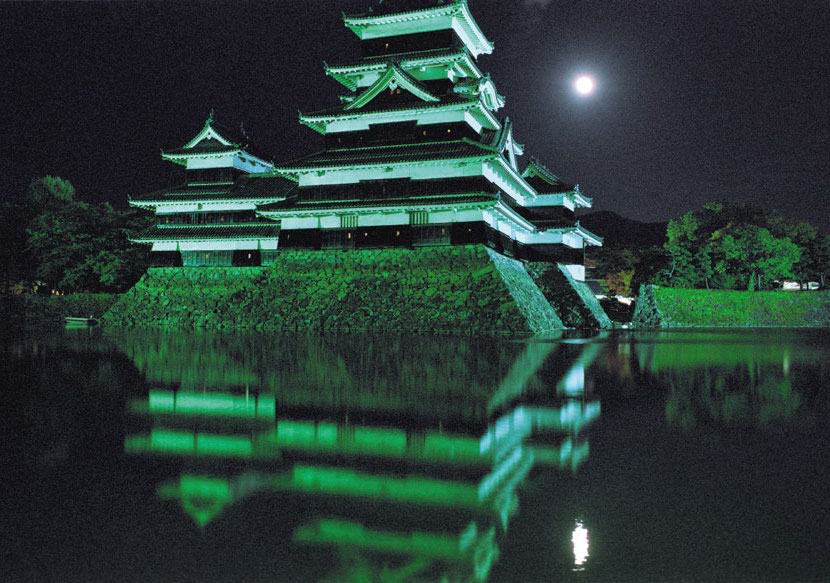平成18年10月6日、鹿児島市の中秋の名月は桜島の真上から出たらしいが、当直で見過ごした。翌日、鹿児島を発って松本から飛騨山脈に向かった。当地は生憎のみぞれで、山々は雪化粧をしていた。散策も撮影もままならず、聞きしに勝る混雑を逃れて松本に帰った。夜の松本城、本丸庭園では、のどかに「月見の宴」が行われていた。宴の庭園から天守閣を仰ぐと月光は背中から射していたので、天守閣の裏に回り静かな堀端から満月を眺めていた。
