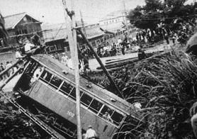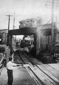 *始め朝日通り朝日相互銀行から左に曲がり西郷さんの銅像から右に曲がって県立病院(大学病院・今の医療センター)から岩崎谷に曲がっていた。昭和24年4月電車がカーブを曲がり切れずに七高(黎明館)の堀に転落した事故があり(写真1)丁度私が医局にいた時で怪我人が運ばれて来た思い出がある。以前の大学病院の裏に「岩崎谷」停留所があったが高架になっていて下を国鉄の機関車が煙を吐いて通過する姿は勇壮だった。(写真2)しかも停留所が高く周囲にビルなどない頃だったから正面に桜島の勇姿も眺められて印象に残っている。この線も清水町が終点だったが市としては磯まで延ばす予定があったそうだ。自動車の渋滞に押されて昭和60年頃廃止されている。