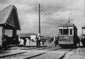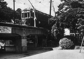 電車の集電装置はポール式で終点や折り返し点に着くと若い助手さんが長いロープを引っ張ってポールの向きを替えるものだった。これが大分重そうでご苦労さんだと思っていたが戦後はパンタグラフになってこちらもホッとした。