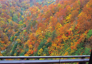 機会あって青森の八甲田山に登った。道端の白樺の幹に白い文様が美しい、数年前モスクワでシベリア鉄道の沿線の白樺林で眺めた時ソウザとゴンザの苦難の旅を偲んだ事を思い出す。 ロープウェーで登った頂上から町や陸奥湾を見渡して素晴らしい景色だった。然しその時10月末、既に雪が降っていて折角の景色が雪雲に遮られて見えなくなったのは残念だった。バスは更に山奥に進む、周囲のカエデ、ウルシ、ナナカマドの朱、ブナやナラの黄色、全山、錦織り成す絨毯を敷き詰めたような荘厳な林相だった。原生林なのにこの色彩配色の妙に自然の造形の深さをしみじみと味わった。陸奥の晩秋、スケールの大きさ、色彩の強烈さとも圧巻だった。