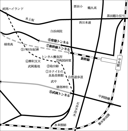 子供の頃の山道とは別に建部神社の裏から武岡に登る自然遊歩道があったが現在武岡中学校の通学路となっている。そこから美術館の脇を通って今の樟南高校グラウンドを横切って今の武岡ハイランドに抜けていた。当時は未だ学校も団地もない、起伏の多いただの広い常葉樹林だった。鳥も動物も自由に見られたが現在は驚くほど切り開かれており中央駅から直通するトンネルが出来て大きな団地とマーケットが出来ている。