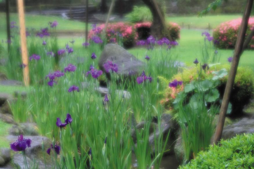 いよいよ梅雨の時期を迎えます。雨や水辺が似合う花というと“花菖蒲”があります。湧水町の三日月池、吉野公園、平川動物公園などが有名ですが、仙厳園の“花菖蒲”も見ごたえがあります。毎年5月中旬から6月はじめ頃、“花菖蒲展”が開かれています。“御殿”周辺に2000鉢程が展示されます。昨年訪れたときは“花菖蒲展”が終わった後でしたが、霧雨の中“曲水の庭”辺りでひっそりと咲く紫の花も、なかなか風情がありました。