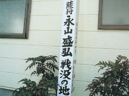 御船の人々は今も尚、彼の人格を忘れ難く永山を土地の守り神として尊敬している。永山盛弘(通称弥一郎)自刃の地に石碑が建てられたが碑銘は住民に請われて西郷従道が書いたそうだ。尚、彼の死に際して部下であった荷駄大隊で士族の税所篤信も同時に同じ火炎の中で殉死した。石碑は宅地造成中に持ち去られて今は御船クリニックの駐車場に木造になって目立つ所に立っている。(写真A)然も町の主催で昭和46年(1971)4月「御船西南の役まつり」が行われ薩官両軍の慰霊を弔っている。(御舟町役場資料)