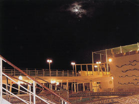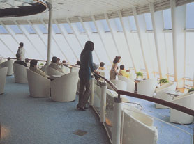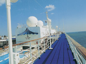 最上階のデッキにレーダー群が並んでいる。このデッキの長さ約100mぐらい。(写真G)船の中央部には一回り400mの長いプロムナードデッキがあり潮風に吹かれながら楽しいジョギングが出来る。