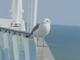 関門海峡の雰囲気は門司、下関の周囲の山並み、700mに過ぎない狭い海峡、激しい潮の流れ、頻繁に行き交う多くの貨客船、それに大橋の存在など鹿児島では味わえない特殊性が有る。丁度夜明けに関門大橋の下を潜った。(写真E)60mの橋の下を50mのマストの飛鳥Uがしずしずと潜って行く。この橋の下は今まで何回か通ったのに改めて圧倒される。デッキの鴎がポーズを取って呉れた。(写真F)