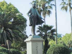 甲突川左岸で高見橋の角、ライオンズ広場は適当な広さで市民の憩いの場所として親しまれている。かねては軽い運動場になり春と秋には木市が開かれて市民に潤いを与えている。そこに昭和40年11月にライオンズクラブから銅像が立てられて池や噴水と共に市民の心を癒していた。ところが昭和54年9月にその前面に立ち塞がるように大久保利通の銅像が立てられた。