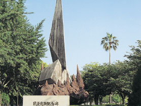 甲突川左岸、高見橋の近くにスッと尖鋭に立ち上がった特異な塔がある。昭和20年(1945)6・17の夜23時、B29の大規模な焼夷弾攻撃があり鹿児島市全部が一夜にして焼け野が原になった記念塔だ。