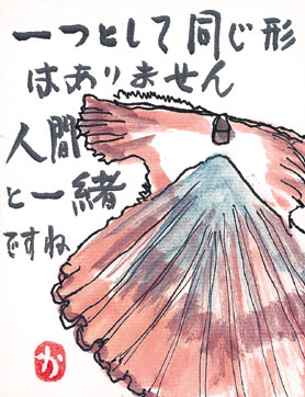 始めて6年、上手く見せたい自我を超えて自然体で生きる術も学んだ。素直にものを見て描き、喜びの瞬間を切り取ってメッセージを添える絵手紙は幾つからでも始められるし、50円で思いのたけを伝えられる手軽さもある。日常に潤いと豊かさを実感し描くことが生活の一部となった。そしてずーっと自然体の徳山和子で在りたいから、喜びのシャワーをかけあって仲間づくりに励む。