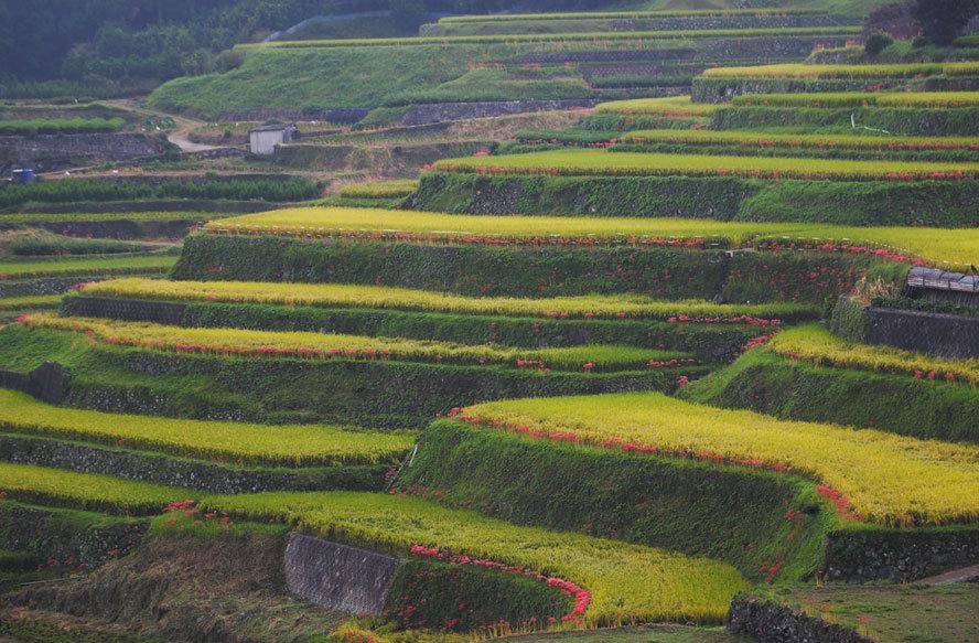 日本の棚田百選にも選ばれた星野村広内・上原地区の棚田です。水田一面に実った黄金色の稲穂と畦一面に咲き誇る真っ赤な彼岸花とのコントラストが美しく、どこか懐かしさを覚える風景です。山を切り拓き、ひとつひとつ丹念に石を積んで造った先人の苦労がしのばれ、棚田と共に暮らそうという思いが伝わってきます。日本の原風景といえるかもしれません。