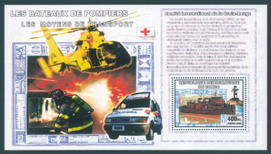 切手に消防艇と灯台。シート地に救急車、消火活動する消防士、移送ヘリを描く