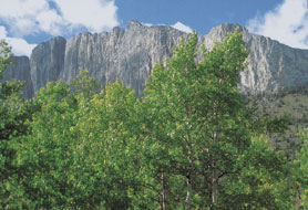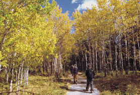 その昔先住民がよく狩をしたカナナスキスの岩山の近辺までポプラの深い森の中を歩く。途中黄金色に黄葉したアスペンの葉と白樺そっくりの白い幹のコントラストがとても美しい。途中には急な登りもあり息があがるが、やがて森を抜けると遙か遠く山々が繋がり、眼下には見渡すかぎり草原と湿原が広がっている。見晴らしの良い緩やかな斜面からはハート型をしたその名もハート・レークが眺められた。この日のハイキングの到達地点である垂直に聳え立つヤムナスカ山(2,800m)の岩場ルートの直下で、折からの強風に吹き飛ばされないように気を配りながら、大きなおにぎり2個が入ったボリュームたっぷりの和風ランチを残さず平らげる。帰りは同じルートでゆっくりと下山する。午後はボウ河の激流とその背景をなす遠く雪を戴いた山々の雄大な景色を観に行く。