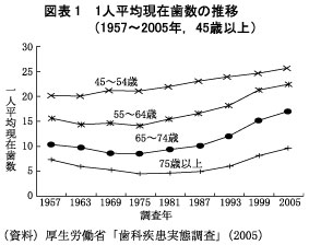 日本歯科医師会では、8020運動(80歳になっても20本以上の自分の歯を有し不自由なく食事が取れる人を増やす運動)を国家施策として活動中ですが、2005年時点での実態は、80〜84歳で20歯以上保有している者の割合は21.1%であり、1人当たり8.9歯でありました。70〜74歳で20歯以上保有している者の割合は42.4%であり、1人当たり15.2歯でありました。60〜64歳は20歯以上保有している者の割合は70.3%であり、1人当たり21.3歯でありました。