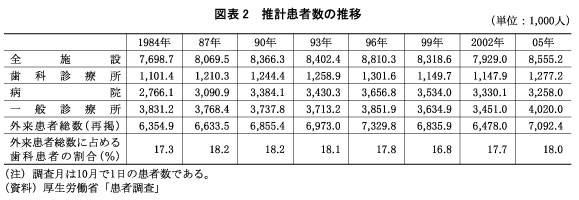 全国の歯科患者数は「患者調査」で見ると、2005年10月1日の歯科推計患者数は、127万7,200人と推計されています。(図表2)これは、医科を含めた全外来患者数の18.0%を占めています。