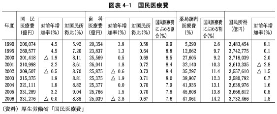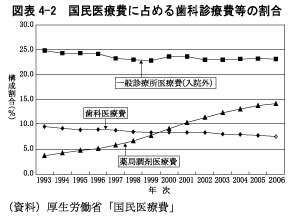 国民医療費に占める歯科診療医療費の割合の推移を見ますと、89年度に約10%を占めていたのが、徐々に減少し、95年度には8.8%に、99年度は8.3%と10年間に約2%という急激な減少をしています。(図表4-1)(図表4-2)