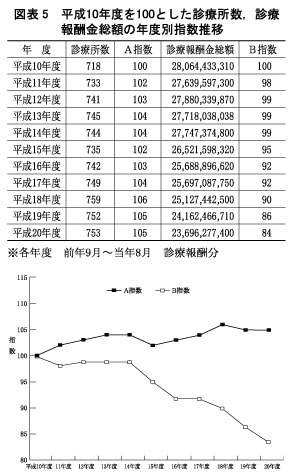 また、診療報酬金総額のB指数は、少しずつ下がってはいましたが、平成15年度あたりから急激に下がり、平成20年度は、84となっています。(図表5)