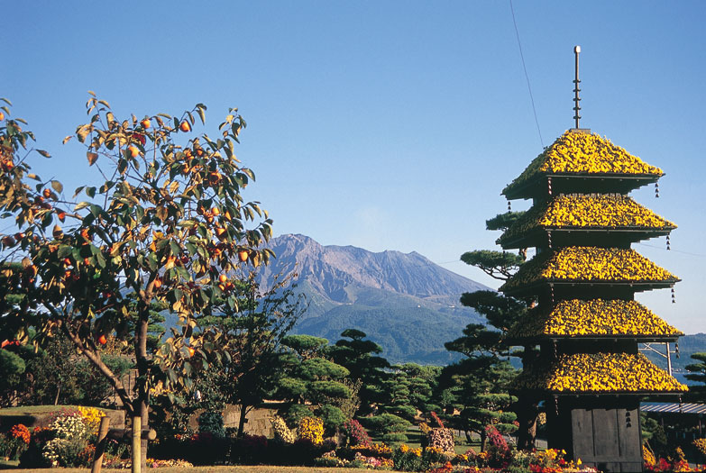 仙厳園は1658年(万治元年)に薩摩藩第19代当主であった島津光久公によって造園された。そこで例年開かれる“菊まつり”、昨年は篤姫ブームもあって斉彬公、篤姫の菊人形も展示された。写真は菊でつくられた五重塔と柿、バックに桜島と澄みきった青空、皆さんも一度はご覧ください。