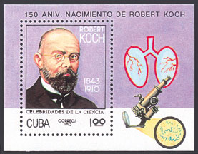ロベルト・コッホ(1843〜1910)シート地に顕微鏡と両側肺、結核菌