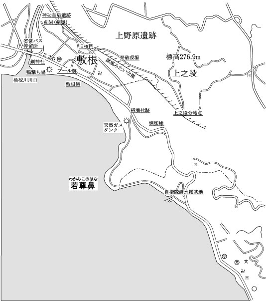 坂の下に堀り切りドンの天然ガスのタンクがあった。ガスを燃料として飴を作っていたと思う。今はない。そのタンクの後ろから若尊鼻わかみことはなを廻って今の自衛隊潜水艦基地を抜けて福山町に出た、あの藪の中のヘビイチゴ(ドクイチゴ)、フキ、竹の子などを想い出す。現在では遊歩道が出来ているそうだ。福山町の宮浦神社の夫婦銀杏の境内で行われる毎年恒例の郡内学校対抗の剣道試合によく応援に行ったものだ。
