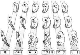 動物学者で思想家のErnst Heinrich Hckelは、ドイツ人であるが、1866年、ダーウィンの進化論に基づいて「個体発生は系統発生をくりかえす」という反復説を提唱し、生命に対して唯物論的一元論の哲学を説いた。思想界に多大な影響を与えた。人間の遺伝的進化論的側面において、現今一般学者に認められ、個体発生の研究によって、その系統をたずね血縁をたどり、進化経路をあきらかにする資とされる。ヘッケルの法則として、ヘッケルは生物が卵から発生して完成するまでの個体発生の実例として、(1)脊つい動物の個体発生の比較、(2)脊つい動物の心臓の構造、(3)ニワトリの胚の窒素排出物の変化、等の下図の3例をあげている。