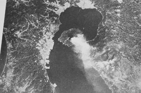 中岳からは目下に錦江湾,磯,天保山越しに鹿児島の街が見え薩摩半島越しに東シナ海,美しい開聞岳が見渡せる。将に天下の絶景だ。桜島は回りに山が無いので周囲360度のパノラマが眺められて実に雄大だ。後年南方に旅した時,遥か上空1万mぐらいの飛行機から桜島を見下ろしたが火口はまるで岩にへばりつくフジツボみたいだった。その孔から一筋の噴煙が見下ろされた(写真4)。