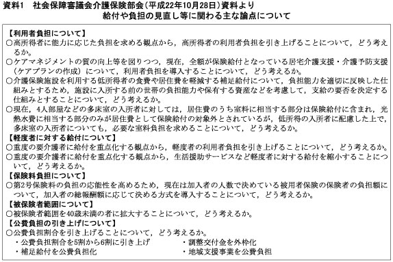 介護保険は,基本にこのような課題を有していますが,財源確保の問題は,サービス水準の低下や給付を受けられる方々の制限を設けることなく,かつ被保険者の負担に限界があることを踏まえると,自然に公費の割合を増やす議論になると思っていました。また,思い切って保険者を都道府県または国として保険料の平準化を図る方法なども出てきそうな議論だと思っていたのですが,厚生労働省は,2012年の介護保険制度改正で,高額所得者について利用者の自己負担(現行1割)の引き上げ,ケアプラン作成に自己負担を求める,補足給付の決定の厳格化,多床室の入所者への室料負担,軽度者の利用者負担の引き上げ,介護予防サービスの縮小,公費負担割合を6割にする,被用者保険の保険者負担を加入者の総報酬額による,2号被保険者の範囲を拡大するなど利用者の負担の増加を今後の対策の論点として出してきました。10月28日の社会保障審議会介護保険部会で提示されています(資料1を参照)。