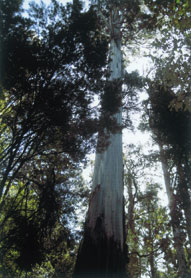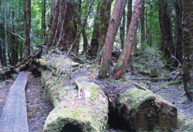 午前ボードウォークで南極ブナ,スノウガムやブッシュペッパーなどの植物を観賞,ついでダブ湖周辺のハイキング。氷河岩,ボート小屋などを経て標高980m地点のビューポイントまで歩いた。生憎の曇りでクレイドル山の一部は雲に覆われていたが,それでも独特の荒々しい岩肌の威容に圧倒された(写真 7)。山の形は丁度阿蘇山群の根子岳に似ている。午後キングビリーパイントラックへ,樹齢1,500年のキングビリーパインを見上げた(写真 8)。