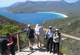 コールズベイ展望台からワイングラスベイ展望台までハイキング。ワイングラス状の美しい海岸の景色,フレシネ第一の景観に歓声をあげる(写真 10,11)。フレシネとはフランスの測量隊大尉の名前に由来しているが,因みにフレシネワインはタスマニアワインの代表でもある。日本の捕鯨を厳しく非難するオーストラリアも,その昔捕鯨に力を注いだ時期があって,湾内が解体された鯨の血で真っ赤に染まったという。ワイングラスベイという素敵な名称にも意外に暗いイメージもありそうだ。