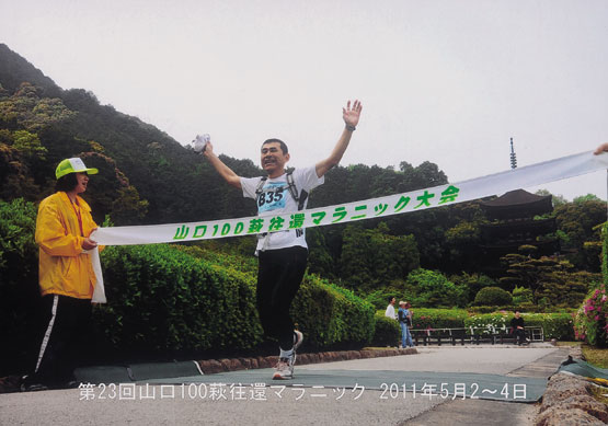 今年もやってきた。平成23年5月3日午後6時,エイエイオーという掛け声とともに意気揚々(?)と山口萩往還140キロコースをスタートした。ただ,今年は少し不安がある。昨年250キロの部にエントリーして,足の故障にてやむなく180キロ地点でリタイアしたこと。本大会の4日前に頴娃(えい)新茶大野岳登山レースで18キロを走ったばかりだったことなどが,足にどう影響するか未知数だったからだ。そんな状態でスタートしたためか,案の定,走り始めて直ぐに足の張りと体の重みを感じ,思うように前に進まなくなった。次の休憩地点でリタイアかな。翌午前0時半,不安を抱えながらも何とか49キロ地点の山口福祉センターの休憩所にたどり着いた。そこで,おにぎりをほおばり味噌汁をいただきながら,足のストレッチとマッサージを念入りにやる。少しずつ老廃物が浄化されていくようで,何とか再出立できそうだった。さぁ,あと101キロ,これから佳境の萩往還の山道に入る。萩往還の急峻でデコボコの石段と砂利の登り道は自重し走らず早足で歩く。徐々にではあるが,足の張りが無くなり,重かった体も軽くなっていく。いつしか思考にも余裕がでてきた。いつものように地面が小生に語りかけ,我が身と我が心を癒してくれる。