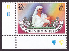 医療・診療のパートナーとして看護師さんは絶対的な存在です。看護師が図案に登場する切手を紹介します。今回はイギリス領ヴァージン諸島発行切手。ミレニアム記念切手として6種発行,1枚に看護師を描く。
