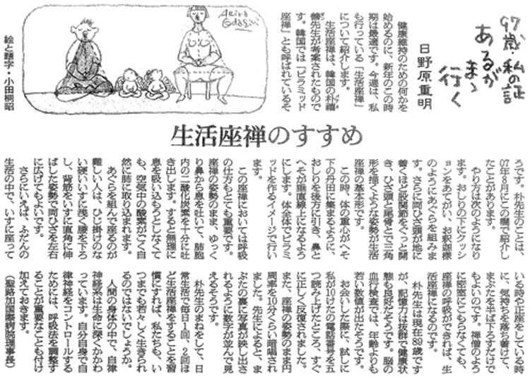 平成21年1月10日の朝日新聞付録欄に聖路加国際病院理事長 日野原重明先生の「生活座禅のすすめ」が掲載されていました。仏教の坐禅を修行,弁道する1人として多くの人に読んでもらいたいと思い,著者の許しを得て引用させて頂きました(下記参照)。