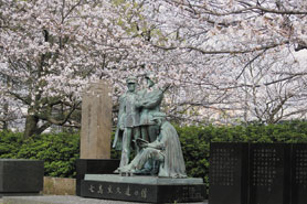 昨年春,桜の咲き誇る黎明館を家内と訪ねた。七高生久遠の像の前に,右に「北辰斜に」,左に 「楠の葉末」の歌詞を刻んだ石碑があるが(写真),関西方面からと思われる旅行者がその石碑を興味深げに見ておられたので,此処は旧制高校の跡であること,寮歌の由来,この「北辰斜に」と 「楠の葉末」の2つは全国で歌われている有名な寮歌であることを説明し,「楠の葉末」を口ずさんであげた。旅行者も喜んで下さったが,初めて聴く私の七高寮歌に家内が感激していた。