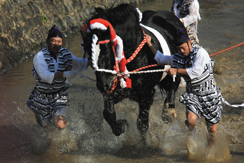 熊本県の八代市に九州三大祭りの1つと言われる妙見祭(11月開催)があります。この祭りは,かつて八代郡及び八代城下の民衆とともに「天下太平・国家安全・五穀成熟」を祝い,楽しむために行われてきました。今でも伝統的な行事が引き継がれ神輿を中心として,奴,獅子,笠鉾,亀蛇などがお供する豪華な祭礼行列が練り歩きます。その中でもカメラマンとして興味をそそられる行事が,この写真に見られる馬が川の中を水しぶきを上げながら疾走する場面です。砥崎河原で神馬が水しぶきをあげて走る勇壮な姿は,非常にダイナミックです。この場面を撮影しようと日本各地から泊りがけで写真愛好家がやってきます。小生も2回ほど行きました。早朝から行ったにもかかわらず,ベストポイント(橋の上からです)にはすでに夥しい数の三脚が所狭しと据付けてあります。聞けば数日前から場所取りをされているとのことでした。この手の撮影は厚顔無恥を決め込むこと,遠慮をしたらシャッターチャンスはないと思えと言われます。小生元来気が弱いものですから,この手の写真撮影は苦手です。鳥取から来たといわれる老夫婦が座って撮影しておられたので,彼らの頭越しにレンズを出さしてもらい連写撮影した内の一枚です。