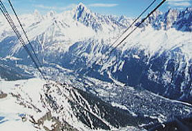 シャモニーでは“クラブメッド(後述)”に宿泊して優雅なスキーリゾートスタイルを満喫。ここでは氷河スキーを生まれて初めて体験しました!!山頂に着いたらまずガイドと命綱をつけて,数百メートル山の峰を歩きます。右に落ちても左に落ちても命を落とす横幅たった数メートルの峰を歩いて氷河に辿り着いたら,広大な氷の上を果てしなく果てしなく1日かけて滑り降ります。「カリカリッ」と音を立てて滑る氷河スキー(写真4)。氷の裂け目(クレバス)を避けながら,時々ガイドが立ち止まっては真っ青なクレバスの中を覗かせます。巨大なクレバスに落ちれば間違いなく命を落とすそうですが,ガイドの後を付いて延々と氷の上を滑る氷河スキーは格別なスキーのひとつです。