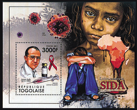 切手は,ポリオワクチンの開発者ジョナス・ソーク(1914−95)の肖像と注射器,ワクチン,レッドリボン。