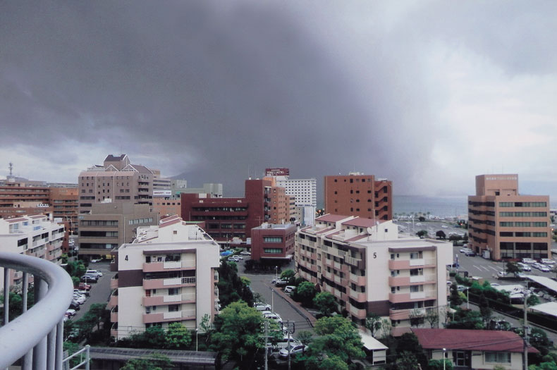 せっかく強い風で掃き清められた鹿児島市内をめがけて,桜島山頂より強大な目の粗い噴煙が吹きだした。間もなく降り注いでくるだろう。