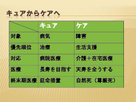 今問われているのは,病院での病気としてのキュア重点の医療よりも,障害を持っていても地域で生活できる医療,ケア中心の医療,介護重点の医療,在宅医療ではないでしょうか。終末期医療も,長寿を目指し延命措置を考える医療から,天寿を全うする医療・ケアへ,自然死・尊厳死を考える医療へと変革していくべきではないでしょうか。