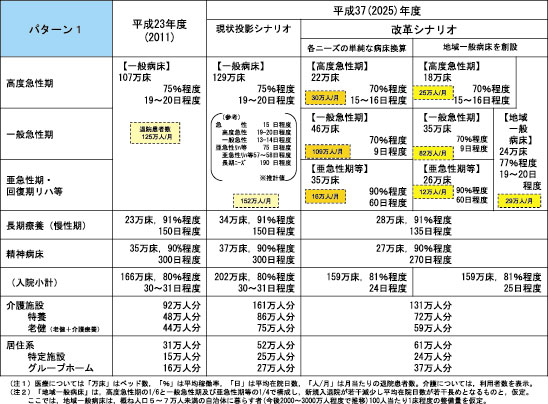 この図は,一般病床では,2011年は107万床であり,現状投影シナリオ(このまま推移すれば)では129万床必要になるが,2025年には高度急性期22万床,一般急性期46万床,亜急性期等35万床の合計103万床にする。地域一般病床を創設するとした場合,これらの中から24万床を地域一般病床に振り向ける。長期療養28万床,精神病床27万床にし,必要と見込まれる病床数より少なくする。介護施設や居住系事業所も同様に収容数を必要数より少なくするという図である。つまり,医療機関や介護施設等に入院・入所できない方々が生じるが,その方々は在宅で療養サービス,介護サービスを受けるということをこの図で明確に示しているのである。在宅での療養・介護の推進は,増大する医療費・介護費を施設の抑制により抑え,一方で増大する医療・介護の需要を在宅で供給しようとする一石二鳥を狙っての施策である。